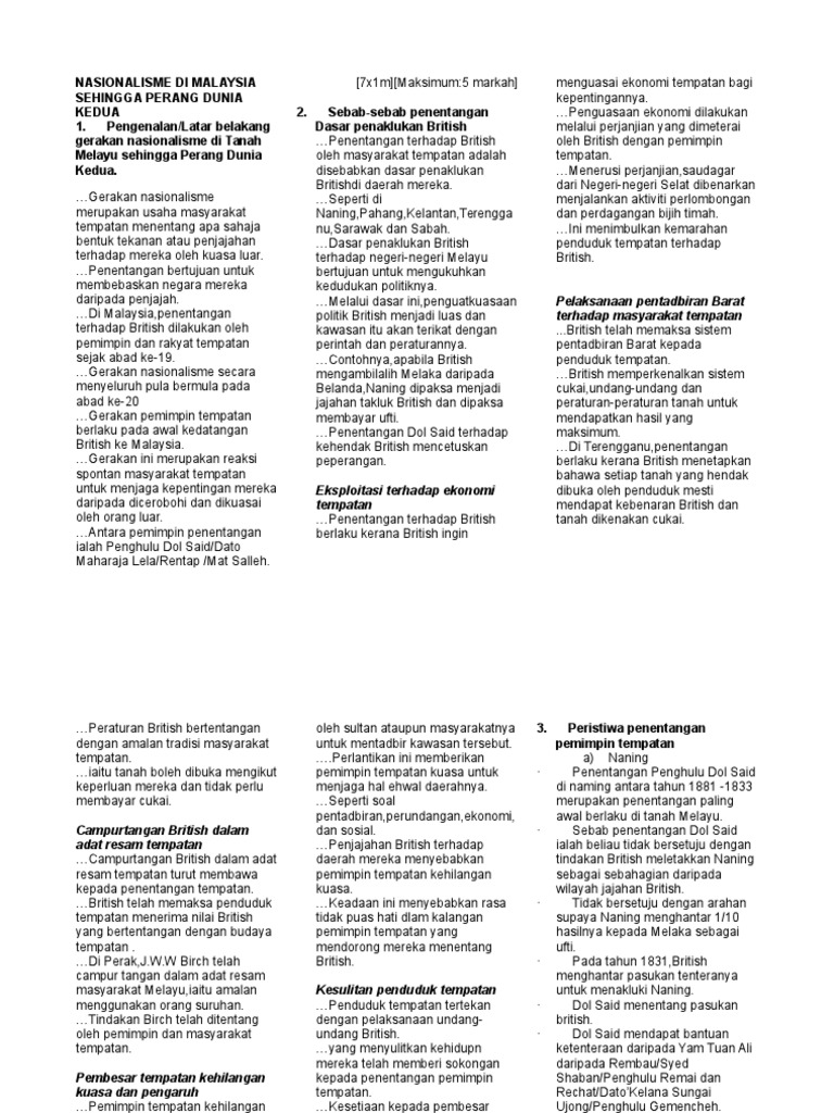 Sejarah Kertas 3 Bab 2 Tingkatan 5 Nasionalisme Di Malaysia Sehingga Perang Dunia Pdf